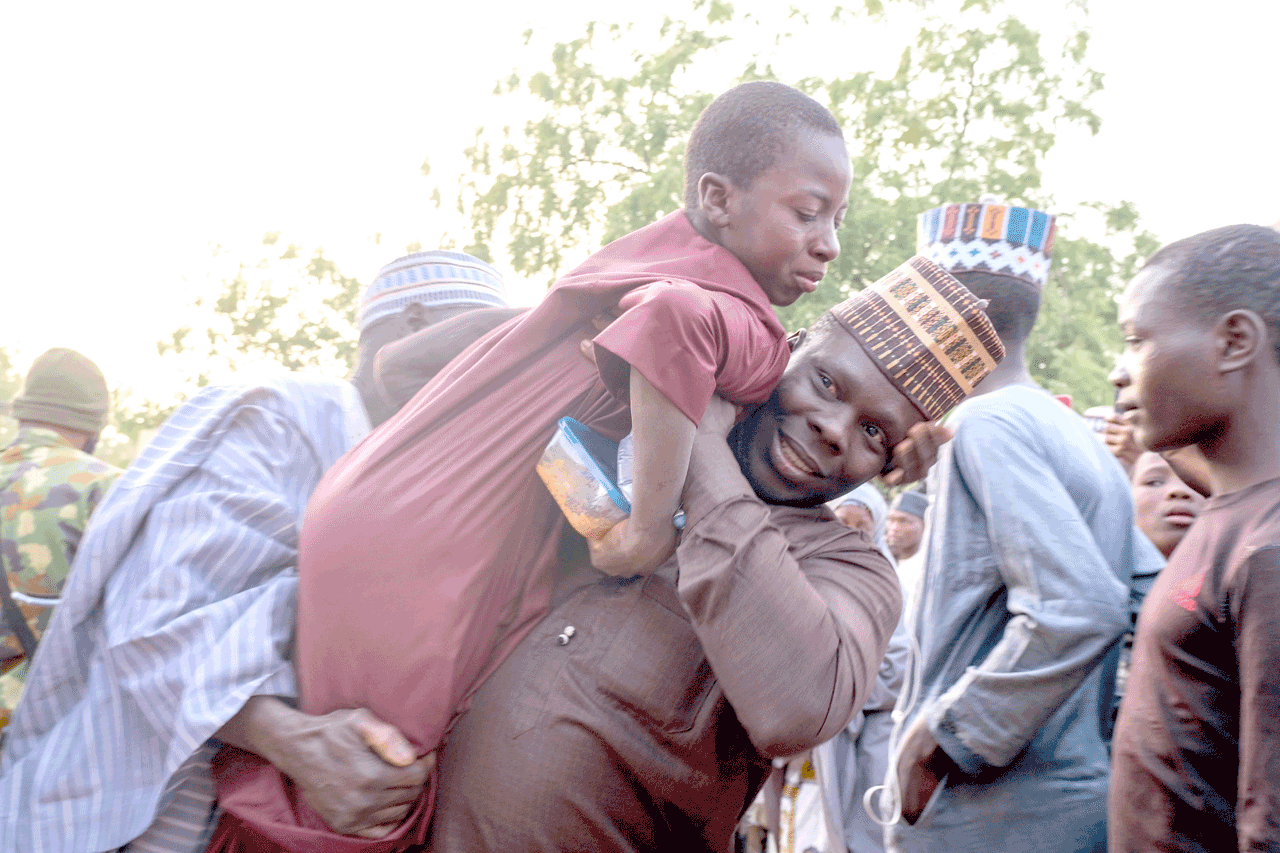 A man reacts as he reunites with his son who was among those who were kidnapped upon their release in Katsina, on Dec 18. — AFP photo