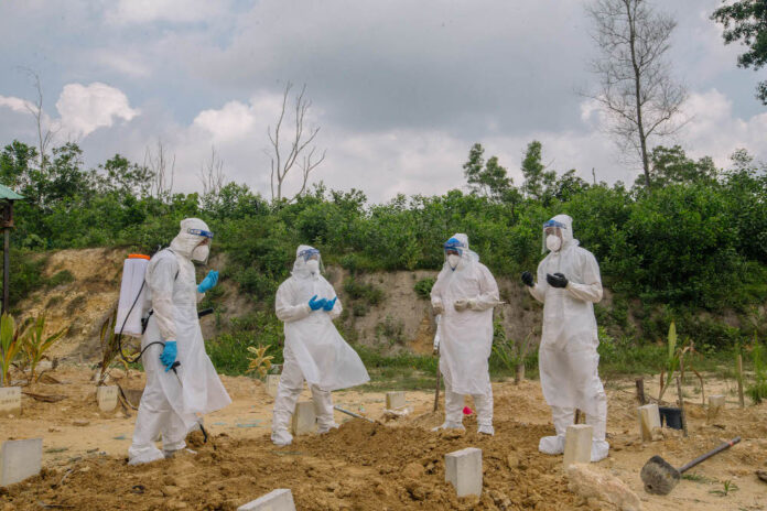Workers wearing personal protective equipment pray before burying a person who died from Covid-19 at the Muslim cemetery in Gombak June 6, 2021. — Picture by Firdaus Latif