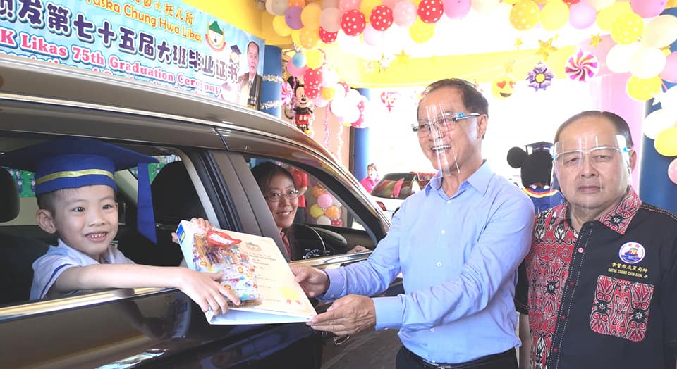 KOTA KINABALU: To minimize the transmission of Covid-19, Likas Chung Hwa Kindergarten has come up with a unique graduation ceremony whereby the children received their certificates in a drive-thru setup.