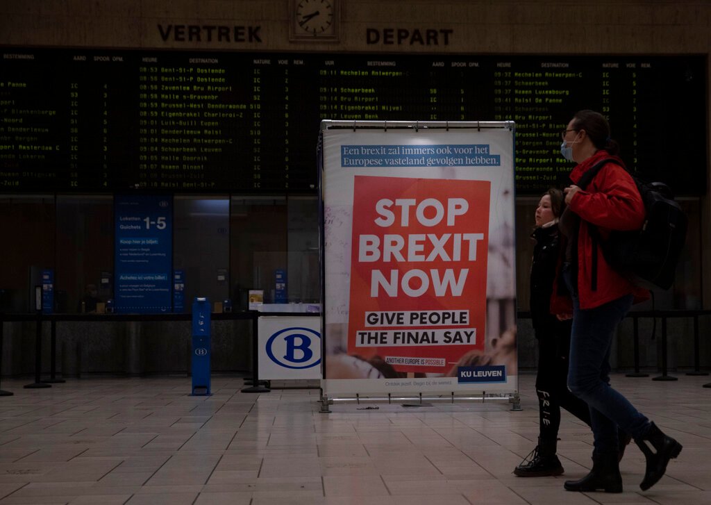 Passengers walk past a banner from the anti-Brexit campaign in Brussels today. (AP pic)