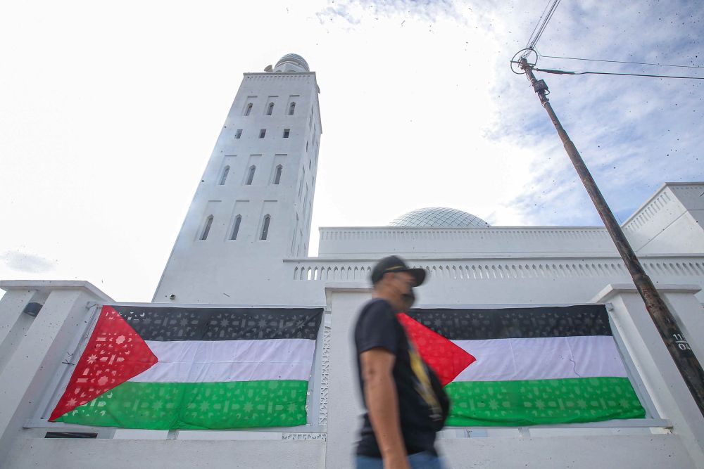 A man walks past Palestinian flags seen on the exterior walls of Masjid Jamek Idris Iskandar Shah in Ipoh on May 18, 2021. — Picture by Farhan Najib