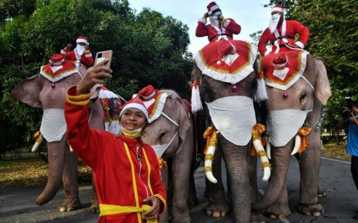 BANGKOK: Christmas and Thailand’s love of elephants combined Wednesday when four of the giant creatures dressed as Santa turned up at a school just outside Bangkok, complete with huge coronavirus masks.