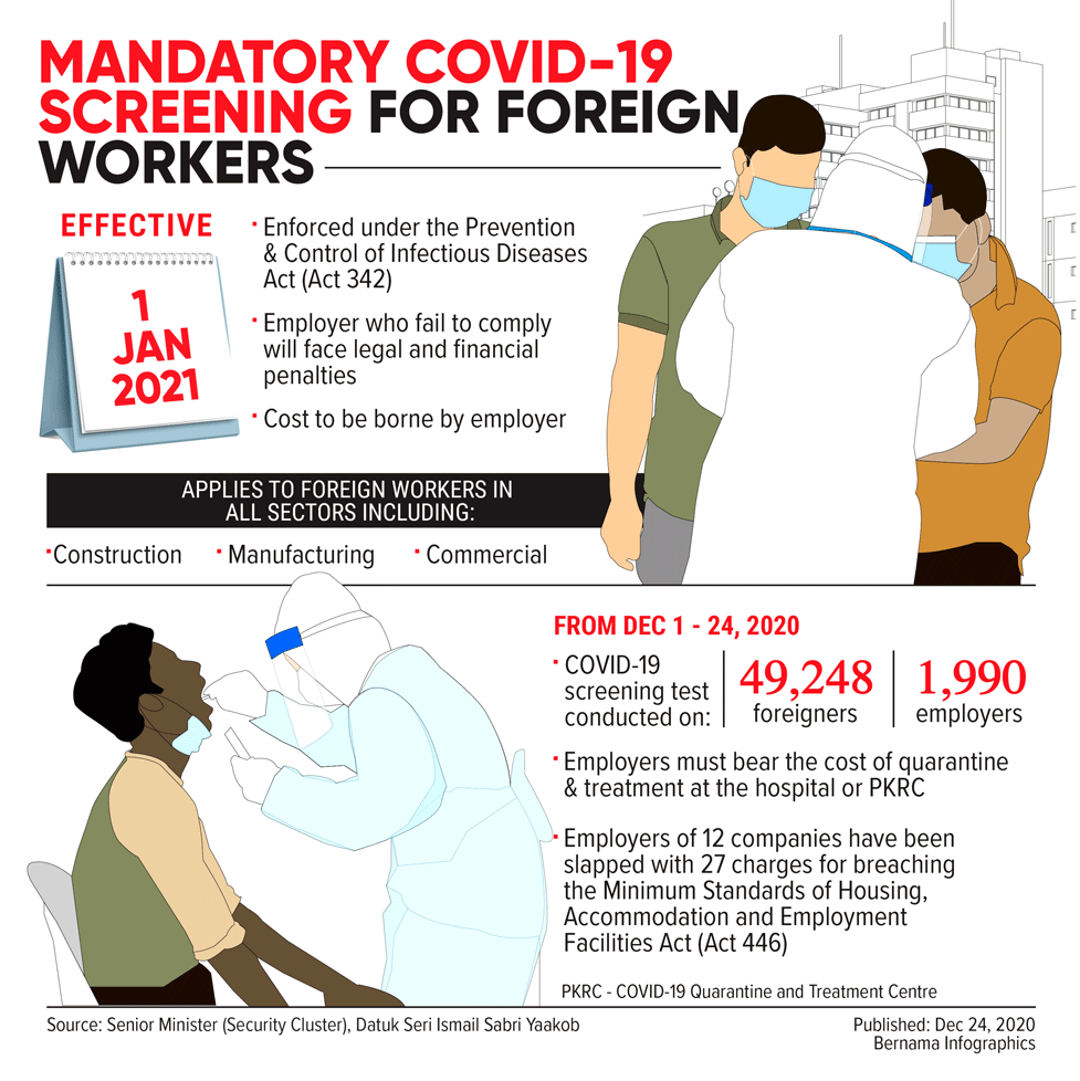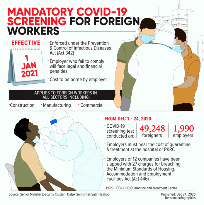 Meanwhile, Ismail Sabri said that the government had agreed to enforce the directive for all foreign workers to undergo Covid-19 screenings under the provisions of the Prevention and Control of Infectious Diseases Act 1988 (Act 342), starting Jan 1, 2021.