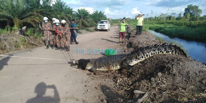 MIRI (Dec 12): A 14-foot-long saltwater crocodile caught last Thursday by the Sarawak Forestry Corporation (SFC) and Batu Niah Fire Station personnel at a drain near an oil palm plantation along the Bintulu coastal road, has been relocated to Benaya Farm or Miri Crocodile Farm in Kuala Baram.