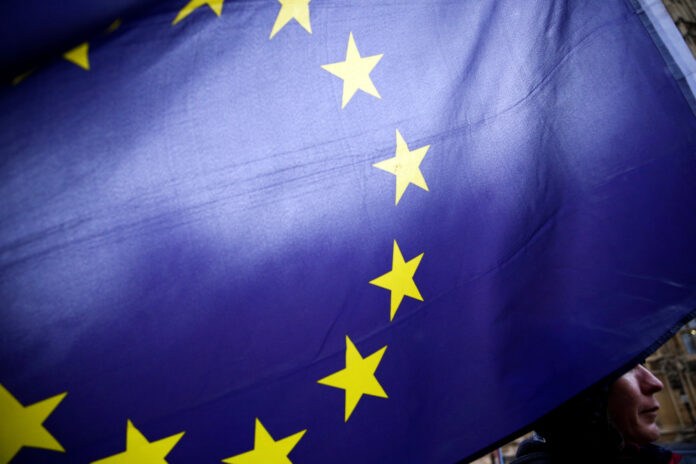 A flag of the European Union is seen as anti-Brexit protesters demonstrate outside the Houses of Parliament in London, Britain March 12, 2019. — Reuters pic