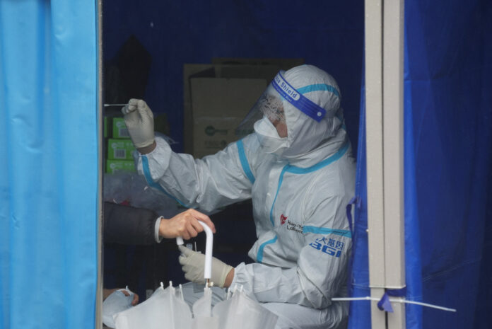 A medical worker collects a swab sample from a person at a makeshift testing site next to a mobile testing vehicle dispatched from mainland China in Tung Chung, Hong Kong February 21, 2022. — Reuters pic