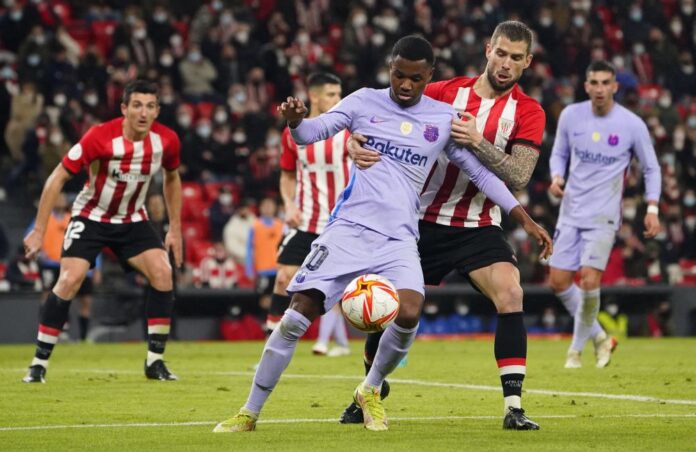 FC Barcelona’s Ansu Fati in action with Athletic Bilbao’s Inigo Martinez at San Mames, Bilbao January 20, 2022. — Reuters pic