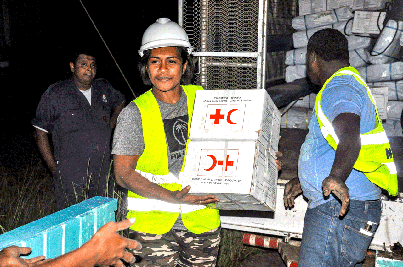 This hand out photo shows ICRC Red Cross first aid, relief and rescue teams clearing debris on roads to reach remote villages flattened by Cylone Yasa near the areas of Bua on Vanua Levu Island.
