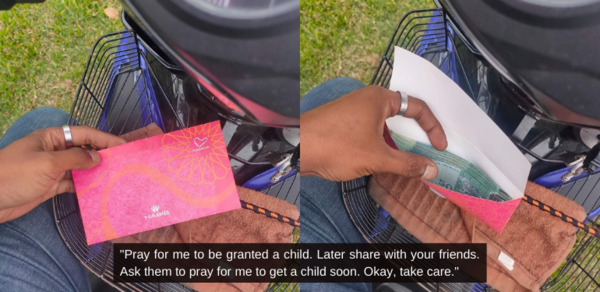 “It’s quite common for customers to give tips in envelopes. But this time I was so shocked to open the packet. Hope my other rider friends will pray for this woman to be granted children soon, god willing.”