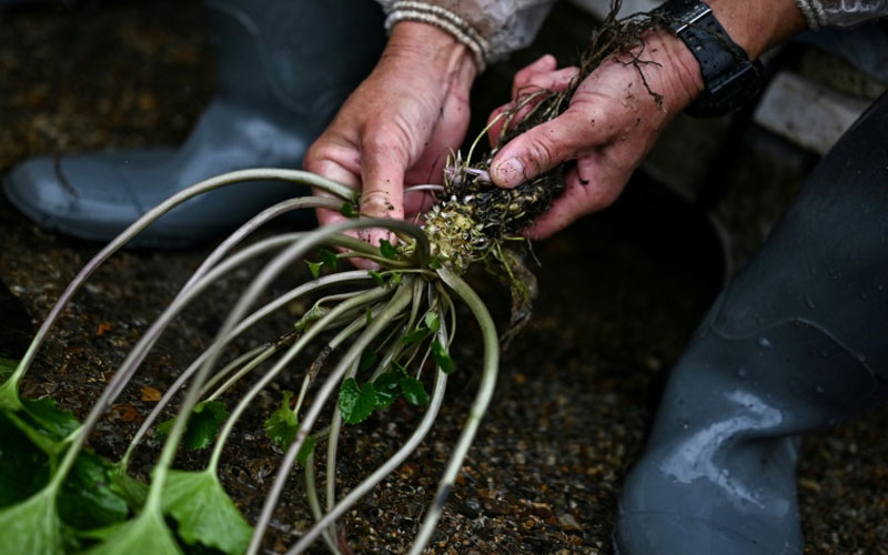 “The most important requirement is crystal-clear water, in abundance,” Yoshihiro Shioya, 62, told AFP as he pulled a wasabi root from the sodden soil at his lush, green mountainside farm on Shizuoka province’s Izu peninsula.