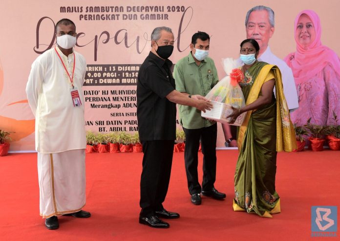 Prime Minister Tan Sri Muhyiddin Yassin (second left) presents contribution to a single mother M.Mathimala (right) when attending the Gambir state constituency Deepavali 2020 celebration at Muniandy Sagil Hall in Tangkak today. Also present was Sri Maha Mathurai Veeran Sri Maha Kaaliyamman Temple chairman Sagil R.Philip (left). – Bernama photo