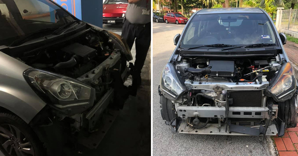 Just as he approached his Myvi, he found that the front bonnet and bumper were completely ripped off and nowhere to be found.