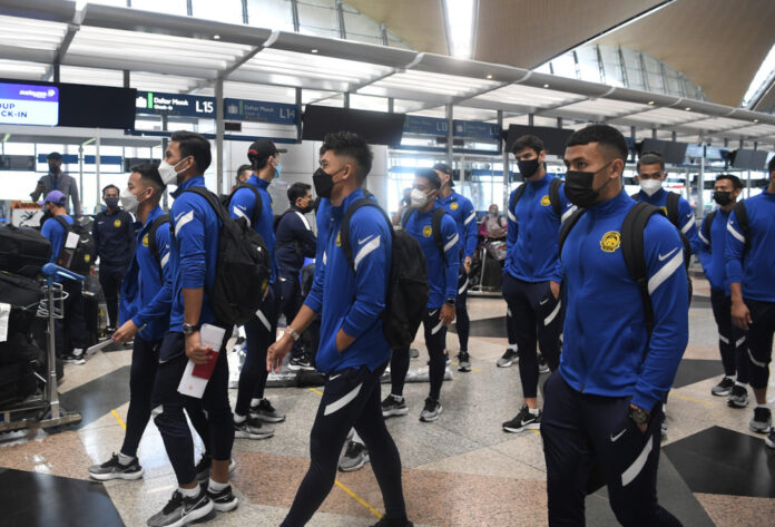 The Harimau Malaya squad at the Kuala Lumpur International Airport for their trip to Singapore, March 22, 2022. — Bernama pic