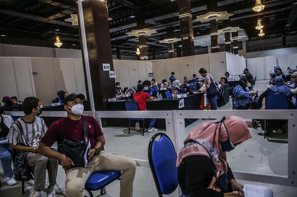People wait to receive their AstraZeneca Covid-19 vaccine shot at the Vaccine Delivery Centre located at Kuala Lumpur World Trade Centre May 29, 2021. — Picture by Hari Anggara