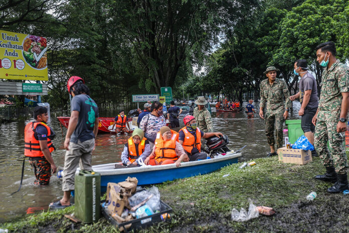 Search and rescue personnel help evacuate flood victims in Taman Sri Muda, Shah Alam December 20, 2021. — Picture by Hari Anggara
