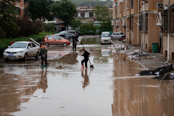 Villagers clear floodwaters near residential houses following heavy rainfall in Yitang county, Jiexiu city, Shanxi province, China October 10, 2021. — cnsphoto via Reuters