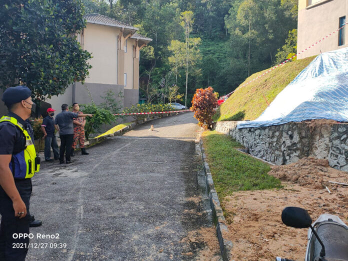 Selangor Fire and Rescue Department (Bomba) personnel monitoring IIUM’s male dormitory where the landslide occurred yesterday, December 27, 2021. — Picture from Twitter/Bomba via Bernama