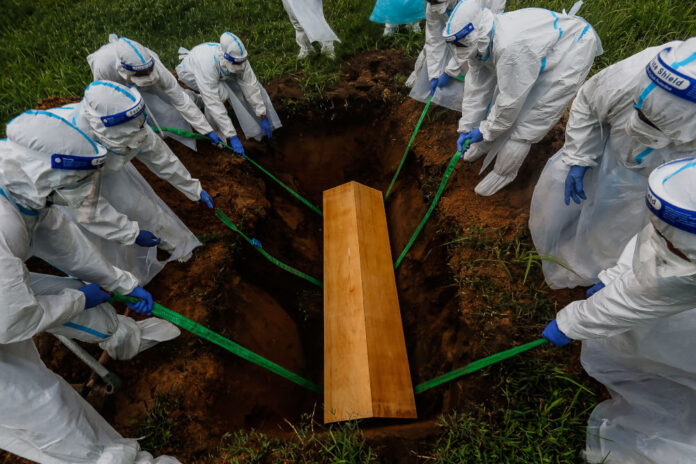 Volunteers lower the body of a Covid-19 victim in the grave for burial at Bagan Ajam Muslim Cemetery, August 24, 2021. — Picture by Sayuti Zainudin