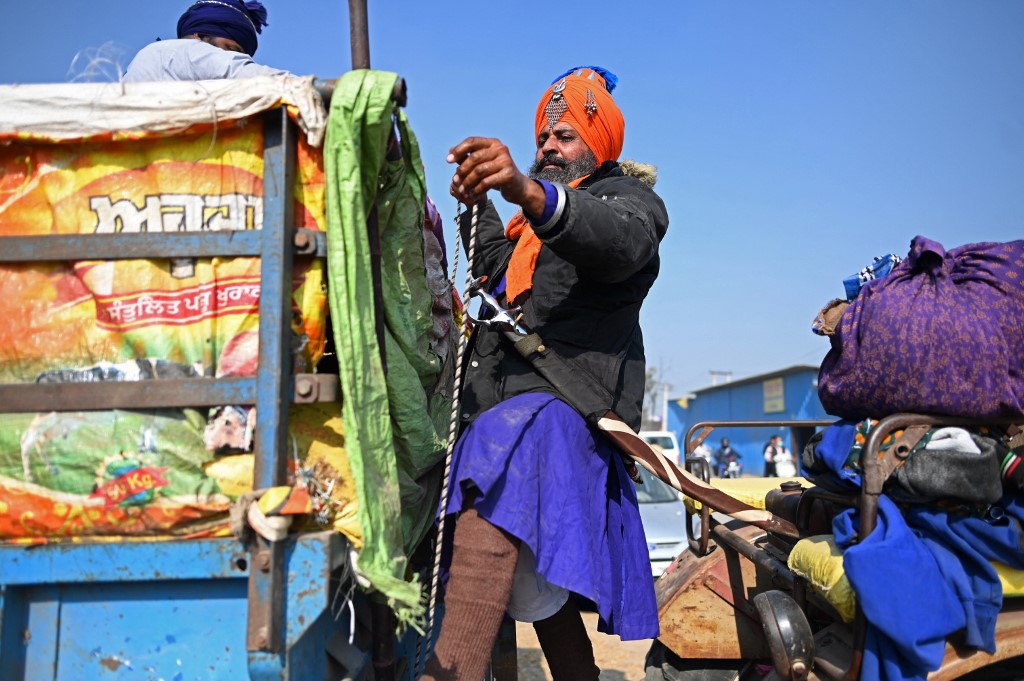 A Nihang Sikh warrior loads his belongings onto a tractor trolley as he along with farmers prepare to leave the protesting site at the Delhi-Haryana state border in Singhu on December 11, 2021, as Indian farmers formally ended year-long mass protests after Prime Minister Narendra Modi abandoned his push for agricultural reforms. — AFP pic