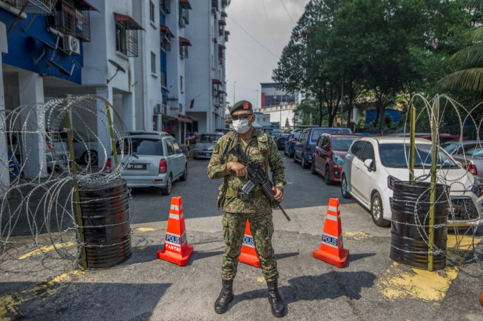 An Armed Forces personnel stands guard in the vicinity of the PPR Kampung Limau in Kuala Lumpur May 23, 2021. — Picture by Shafwan Zaidon