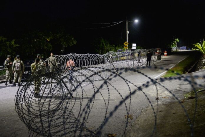 Armed Forces personnel install barbed wire fencing in Kampung Sungai Penchala as the enhanced movement control order kicks in today June 10, 2021. — Picture by Miera Zulyana