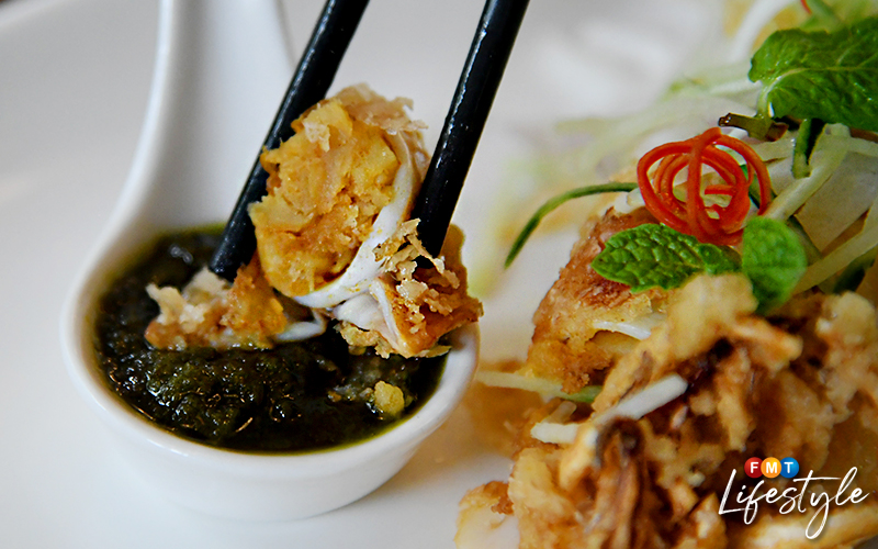 First up from the kitchen is the chef’s take on Malaysia’s current salted egg craze, Crispy Fish Skin with Pandan Salted Egg Yolk.