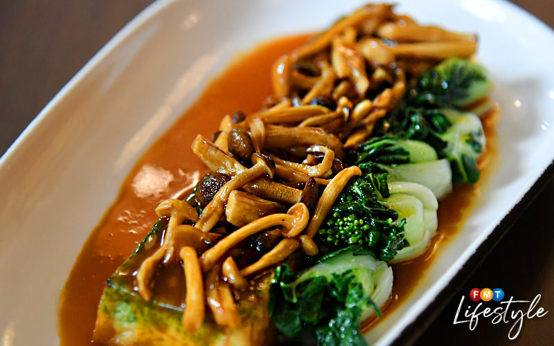 To balance out the smorgasbord of meat choices, a great option would be the Homemade Spinach Egg Beancurd with Stewed Beech Mushrooms.