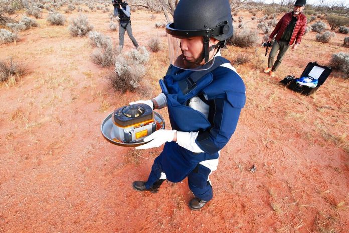 A Jaxa researcher retrieves the capsule dropped by the Hayabusa2 in Woomera, Australia last week. (AP pic)