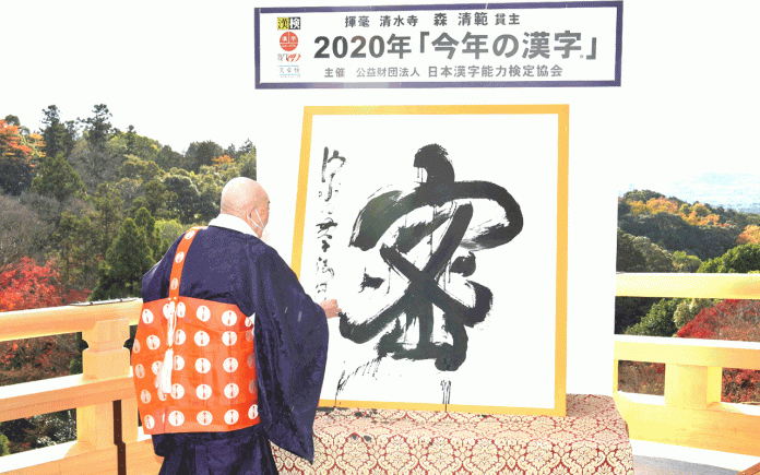 Japanese TV stations broadcast the announcement live, as Seihan Mori, master of the ancient Kiyomizu temple in Kyoto, painted the character on a big white panel with an ink-soaked calligraphy brush.