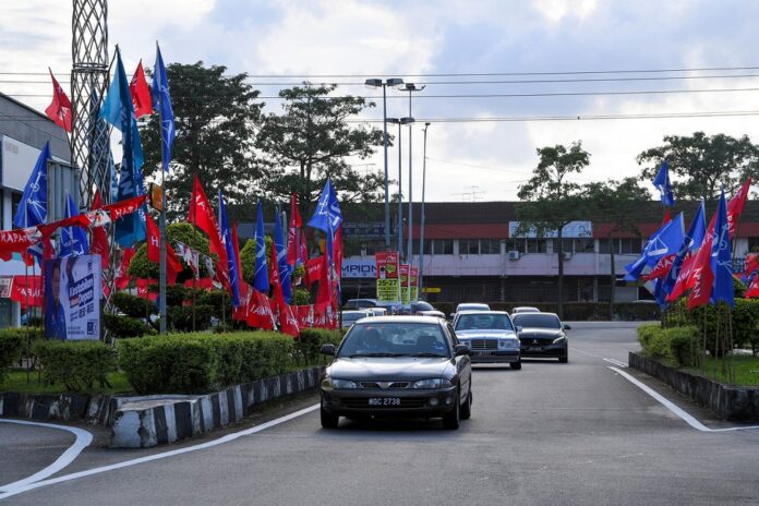 Pakatan Harapan and Barisan Nasional flags line both sides of Jalan Sutera ahead of state elections, in Johor Baru February 28, 2022. — Bernama pic