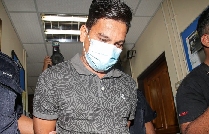 Ruddy Nezeri Kamarudin is led in handcuffs out of the Session Court in Ipoh February 18, 2021. — Picture by Farhan Najib