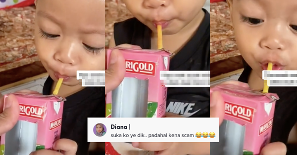 Menerusi video berkenaan, kelihatan seorang ibu membawa air kotak berperisa laici untuk diberikan kepada anaknya.