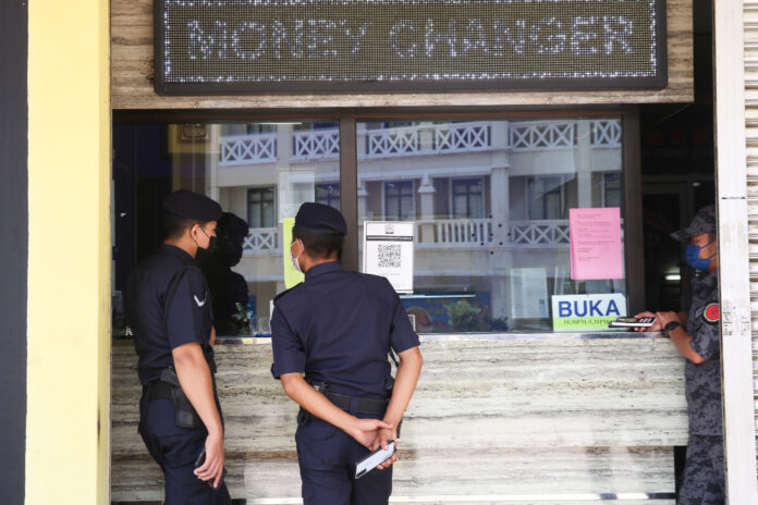 Enforcement officers (Police, Immigration and Army) checking the standard operating procedure (SOP) compliance at shops in Putrajaya, June 14, 2021. — Picture by Choo Choy May