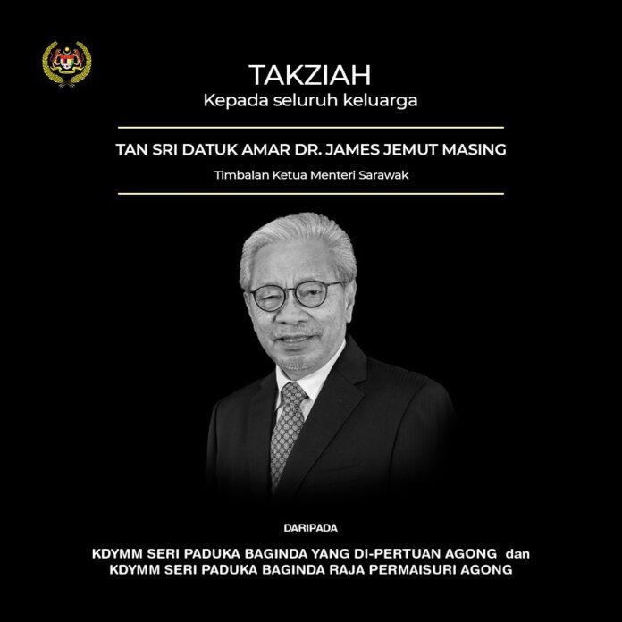 KUCHING, Oct 31 — Yang di-Pertuan Agong Al-Sultan Abdullah Ri’ayatuddin Al-Mustafa Billah Shah and Raja Permaisuri Agong Tunku Hajah Azizah Aminah Maimunah Iskandariah have expressed condolences to the family of Sarawak Deputy Chief Minister Tan Sri Dr James Jemut Masing who died today at the age of 72.