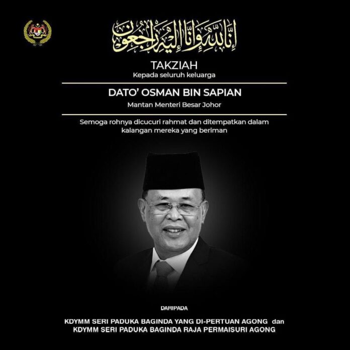 KUALA LUMPUR, Dec 22 — The Yang di-Pertuan Agong Al-Sultan Abdullah Ri’ayatuddin Al-Mustafa Billah Shah and Raja Permaisuri Agong Tunku Hajah Azizah Aminah Maimunah Iskandariah have expressed their condolences to the family of former Johor mentri besar Datuk Osman Sapian who died yesterday.