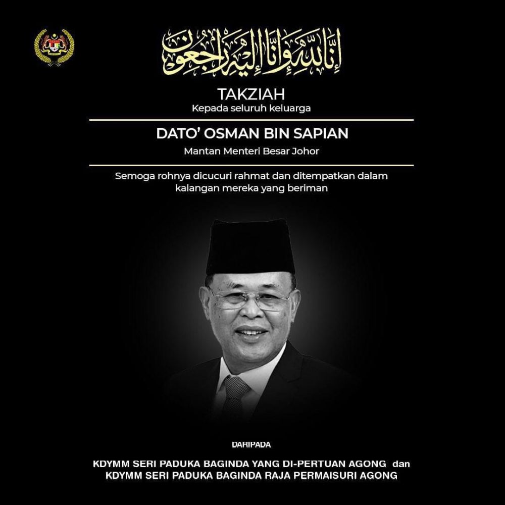 It added that Their Majesties greatly appreciate and praise Osman’s devotion, service and sacrifice to the state of Johor and the country.