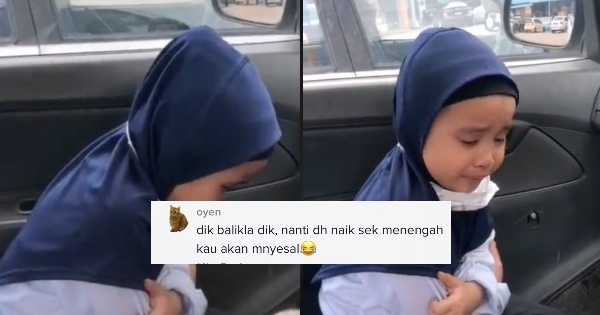 Tidak lama kemudian, budak itu dilihat berlari keluar dari kereta namun sempat dipujuk bapanya untuk masuk kembali. Apa yang menghiburkan adalah apabila budak itu bersungguh-sungguh menangis kerana mahu duduk di sekolah.