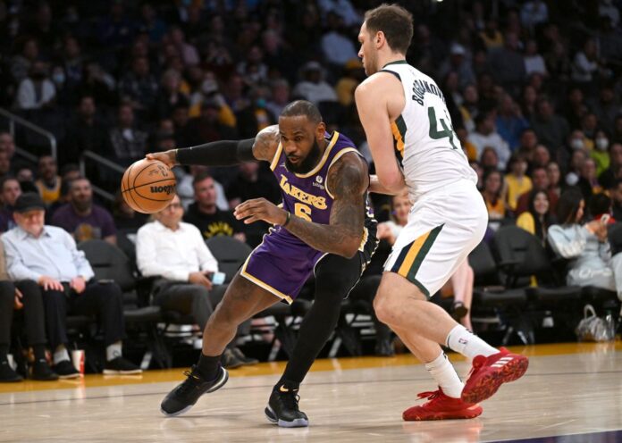 Los Angeles Lakers forward LeBron James (6) is defended by Utah Jazz forward Bojan Bogdanovic (44) as he drives to the basket in the first quarter at Crypto.com Arena, California February 16, 2022. — Reuters pic