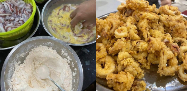6. Gorengkan sotong yang telah disaluti tepung sehingga perang keemasan.