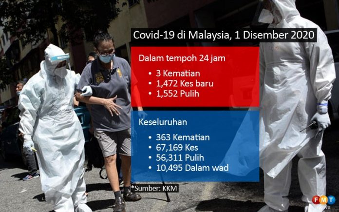 NEWS Lebih 1,400 kes jangkitan Covid-19, sembuh lagi tinggi By - December 1, 2020 0 257 FacebookTwitterPinterestWhatsApp PETALING JAYA: Kementerian Kesihatan melaporkan 1,472 kes jangkitan baharu Covid-19 dilaporkan dalam tempoh 24 jam lalu. Dalam tempoh sama, sebanyak 1,552 pesakit dilaporkan pulih. Sementara itu, tiga kematian dilaporkan hari ini.