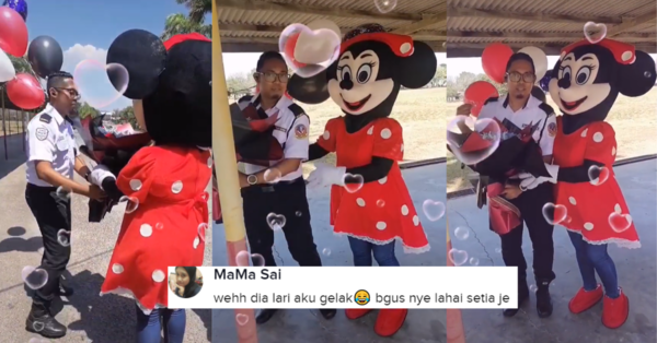Dia kemudian mengenakan pakaian kostum Minnie Mouse untuk dihantar sendiri kepada suaminya. Sebaik saja menghulurkan jambangan bunga duit dan belon, Minnie Mouse itu menunjukkan reaksi seperti mahu peluk.
