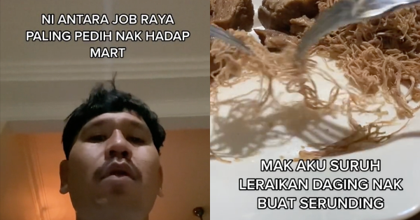 Dia kemudian berkongsi bahawa antara aktiviti persiapan raya paling penat perlu dilakukan adalah apabila ibunya menyuruh meleraikan daging untuk membuat serunding.