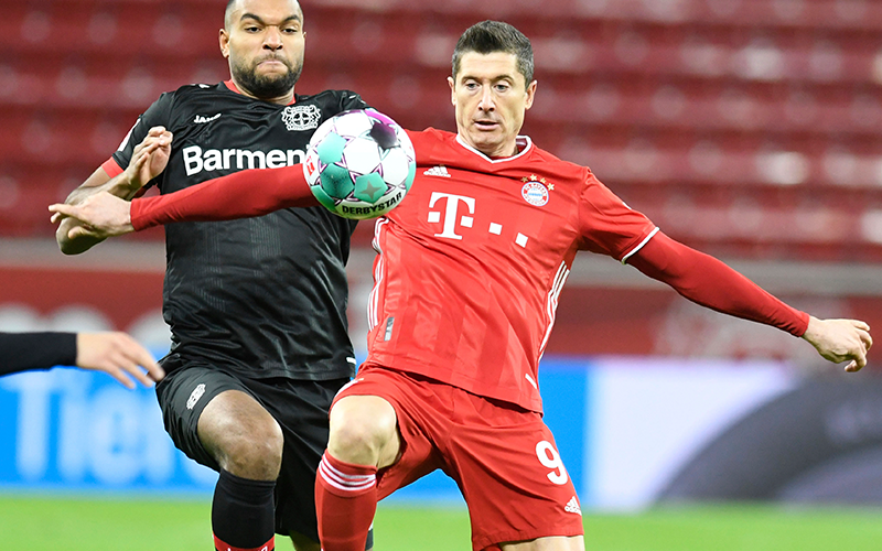 Robert Lewandowski (right) in action against Leverkusen’s Jonathan Tah during the match. (AP pic)