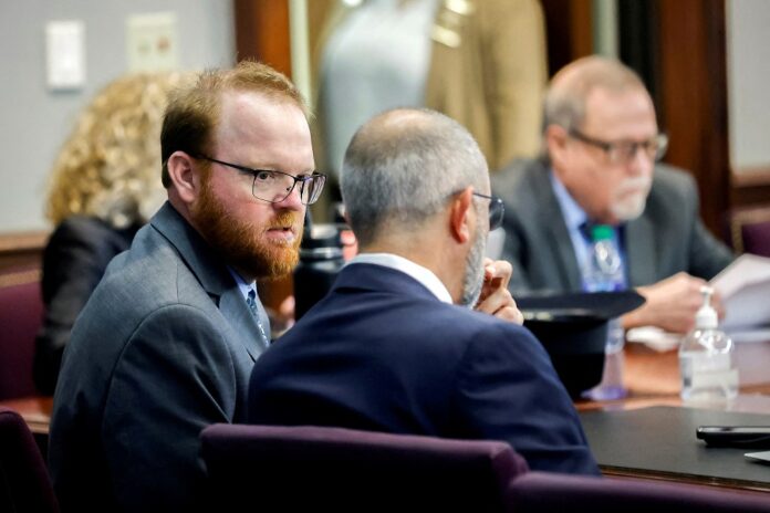 Travis McMichael (left) speaks with his attorney Jason B. Sheffield during the sentencing of him, his father Greg McMichael and neighbour, William ‘Roddie’ Bryan in the Glynn County Courthouse, in Brunswick, January 7, 2022. — Stephen B. Morton/Pool pic via Reuters