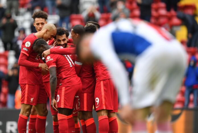 Liverpool’s Sadio Mane celebrates scoring their second goal against Crystal Palace with teammates at Anfield May 23, 2021. — Reuters pic
