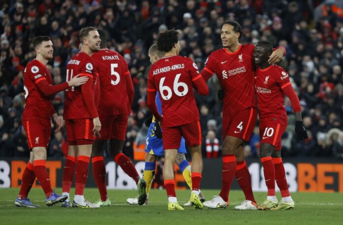 Liverpool’s Virgil van Dijk (second from right) celebrates scoring their fourth goal against Southampton at Anfield, Liverpool November 27, 2021. — Reuters pic