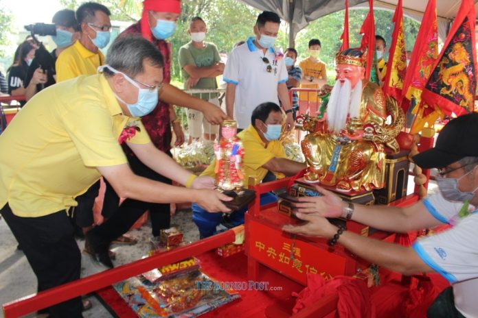 Dr Sim (left) taking part in the ceremony of installing a new deity at a temple near the Sungai Maong bazaar at Mile 3 here.