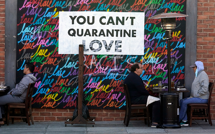 People sit outside a restaurant in Santa Monica on Tuesday. (AP pic)