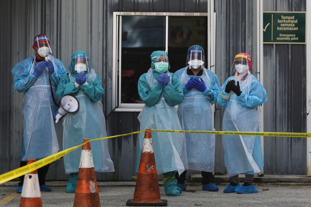 Health workers recite prayers before screening foreign workers for Covid-19 at Kampung Baru, Kuala Lumpur April 16, 2020. — Picture by Yusof Mat Isa