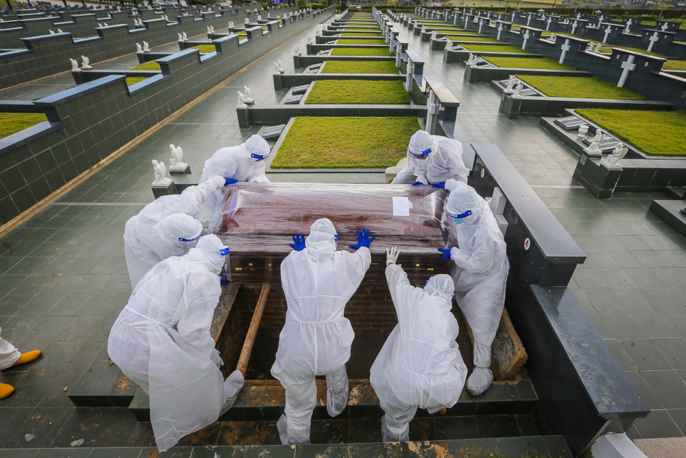 Workers wearing personal protective equipment bury a victim who died from Covid-19 at the Christian cemetery in Fairy Park, Klang June 6, 2021. — Picture by Yusof Mat Isa